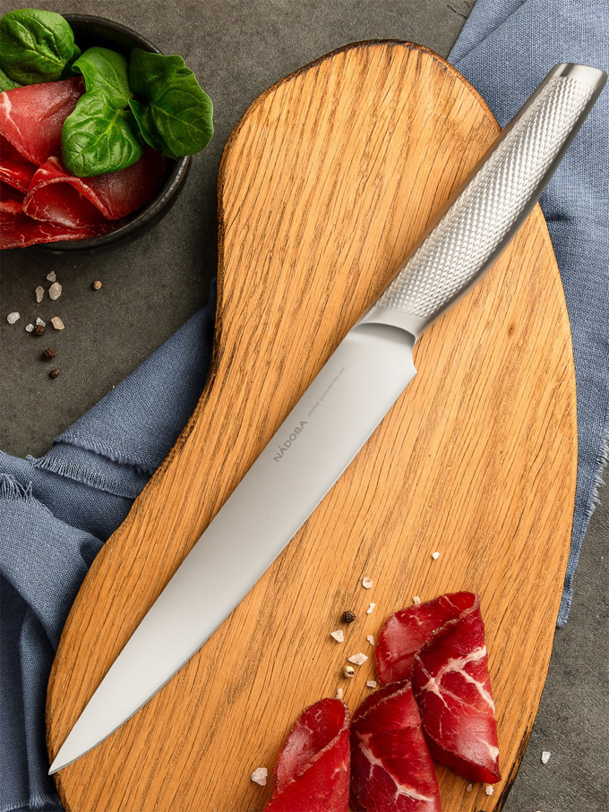 Цельнокованые ножи NADOBA коллекции Blair точно займут особое место на Вашей кухне. Выполненные из нержавеющей стали премиум-класса, ножи не подвержены коррозийным изменениям и долгое время остаются в первозданном виде. Содержание в сплаве углерода, молибдена и ванадия, а также специальная термическая обработка придает ножам высокую твердость по шкале Роквелла (56- 58 HRC).