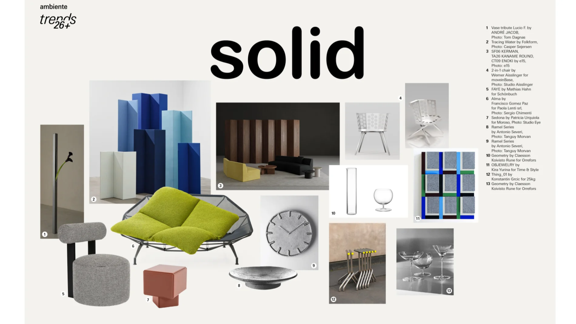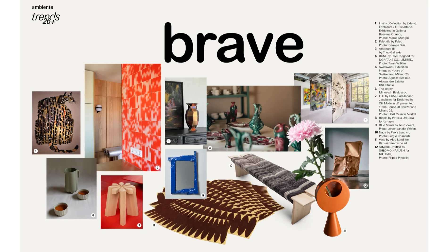 Многолетние партнеры выставки Ambiente - Stilbüro bora.herke.palmisano - специализируется на том, чтобы улавливать общественные настроения и транслировать их в визуальные тренды применительно к индустрии потребительских товаров. Выступая кураторами экспозиции Trends, bora.herke.palmisano предлагают посетителям вдохновение для разработки новых продуктов и планирования ассортимента. Для 2026 года ими были сформулированы три концептуальных тренда, отвечающих на вызовы времени: brave (смелость), light (легкость) и solid (прочность). Каждый тренд раскрывается через сочетание цветов, форм и материалов.