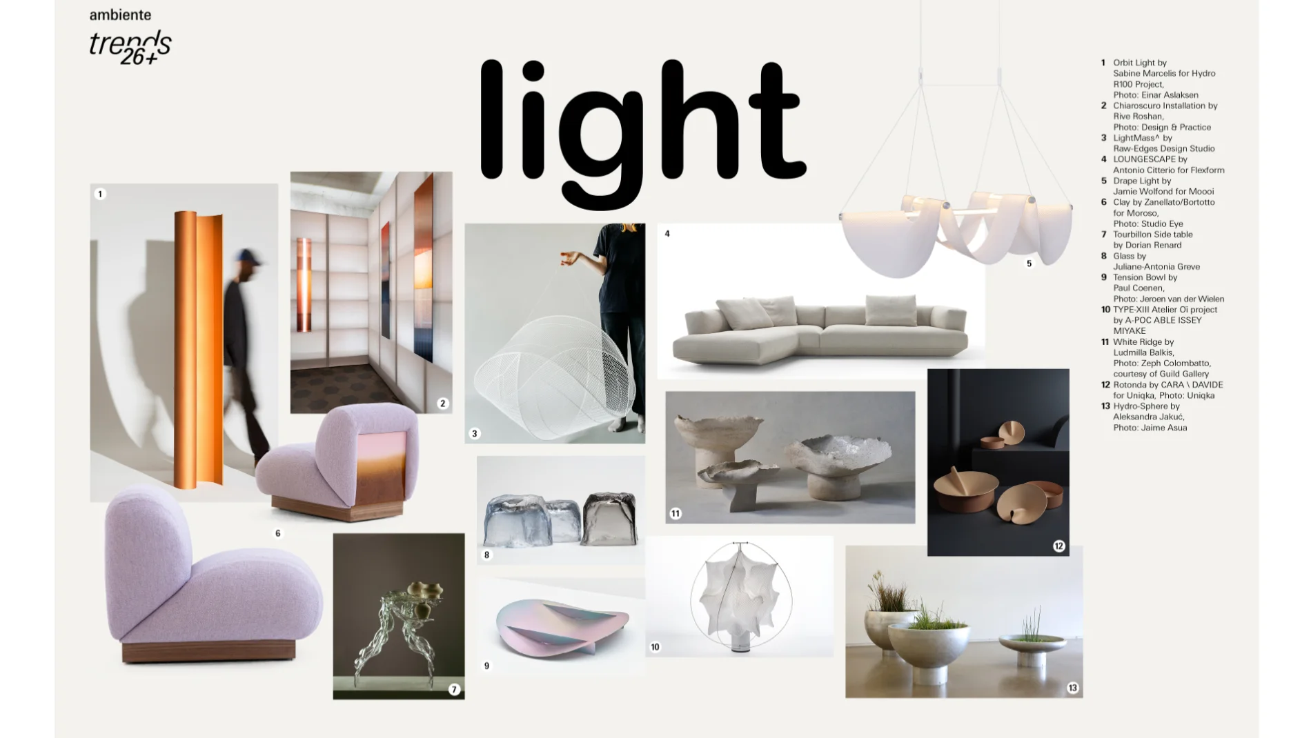 Тренд light приносит ясность и лёгкость. Ему свойственны прозрачность, струящиеся материалы и утончённо динамичные структуры, которые создают пространства, обладающие визионерской притягательностью. Дизайн, кажущийся невесомым, меняет гармонию между спокойствием и энергией, подстраиваясь под настроение. Пастельные тона, серебристые поверхности и мерцающие эффекты привносят новую чувственность в повседневную жизнь. Тренд light создаёт атмосферу, где изящество и сила гармонично сочетаются друг с другом.