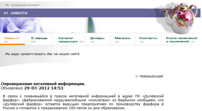 Дулевский фарфоровый завод обвинил своих коллег из Вербилок в фабрикации негативной информации о себе. Заявление об этом было размещено 29 марта на официальном сайте ПК «Дулёвский фарфор». В нем говорится следующее: "В связи с появившейся в прессе негативной информацией в адрес ПК «Дулёвский фарфор», сфабрикованной недружелюбными «коллегами» из Вербилок сообщаем, что «Дулёвский фарфор» остается ведущим предприятием по производству фарфора в России и готовится к празднованию 180-летия со дня образования". О какой именно информации идет речь и где она была размещена, никаких пояснений не дается.
