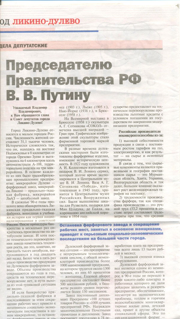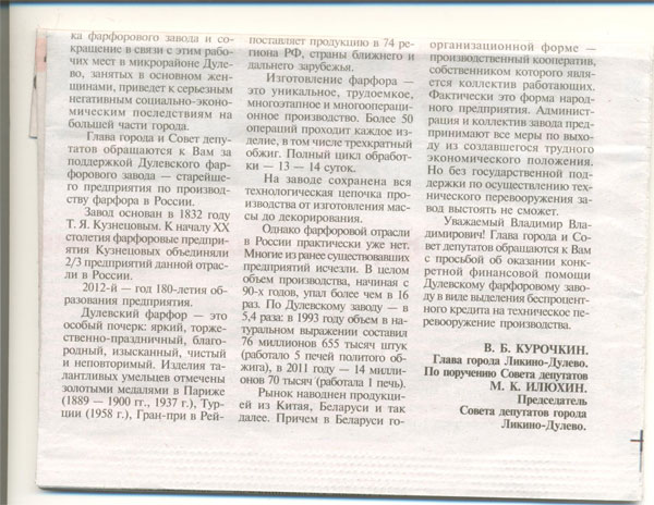 В чем разглядели недоброжелательность и негативную информацию уважаемые коллеги из Ликино-Дулево, мы не поняли. Может быть, Обращение в городской газете к В.В. Путину было напечатано ошибочно, содержало искаженную информацию о заводе или вообще было шуткой?