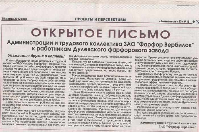 "Мы прочли Обращение к председателю Правительства РФ В.В.Путину в газете №3 (33) «Наш город Ликино-Дулево» от 7 марта 2012 года, из которого явно следует, что Дулевский фарфоровый завод переживает тяжелые времена. Нам близки и понятны все перечисленные в обращении проблемы российского производителя, особенно в изготовлении такой тонкой продукции, как фарфор. Наше Открытое письмо, опубликованное в газетах №12 «Своя газета» и №13 «Компаньон и К» от 28 марта 2012 года, было ни чем иным, как предложением объединить усилия по сохранению двух уникальных российских предприятий, имеющих более чем вековую историю. Мы обладаем необходимым опытом и возможностями для этого, т.к. на протяжении последних пяти лет практически возрождаем к жизни фарфоровое производство в Вербилках и достигли в этом немалых успехов.