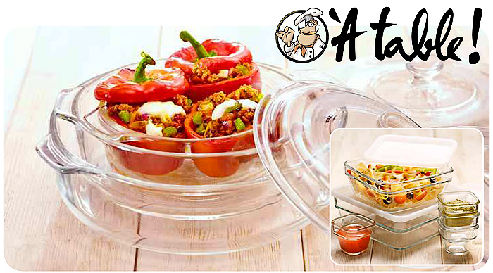 Компания «Строиремонт» приветствует Вас, и вместе с ней новая серия жаропрочной посуды и контейнеров для хранения "À table!» от компании «Royal Leerdam». Жаропрочная посуда выполнена из упроченного стекла, она подходит для использования, как в микроволновой печи, так и для духовки. Контейнеры для хранения «À table!» очень удобны и оригинальны, прочное стекло и вакуумная крышка, надолго сохранят свежесть и аромат Ваших продуктов.