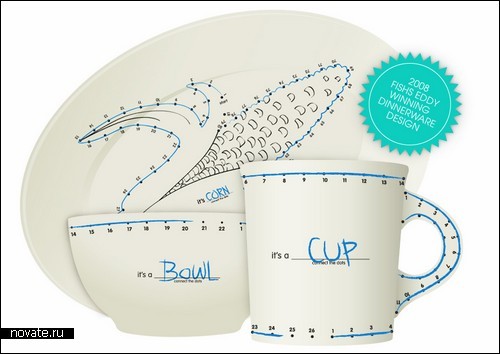 Кстати, большинство картинок из соединенных точек автор подписала. Наверное, если вдруг кто не догадался, что же это такое она изобразила на посуде. Да-да, в отличие от оригинальных рисунков-головоломок, свои точки Эдит Левин (Edith Levin) соединила в картинки собственноручно. Так что поиграть в игру уже не удастся, а вот откушать любимое блюдо с тарелки, на которой написано "это тарелка", и выпить кофе из чашки с надписью "чашка" обладатели посуды Сonnect-the-dots смогут наверняка.