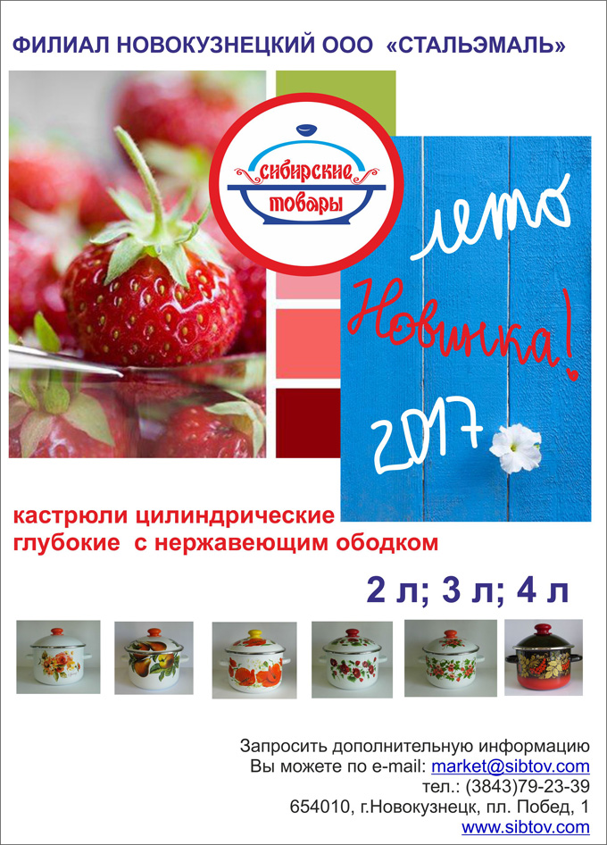 Российская торговая марка "Сибирские товары" представила новинки этого лета – глубокие цилиндрические кастрюли из эмалированной стали с нержавеющим ободком. Объем изделий составил 2, 3 и 4л. Нержавеющий ободок позволяет защитить края кастрюль и крышек, посуда пригодна для использования на стеклокерамических, электрических, газовых, индукционных плитах.