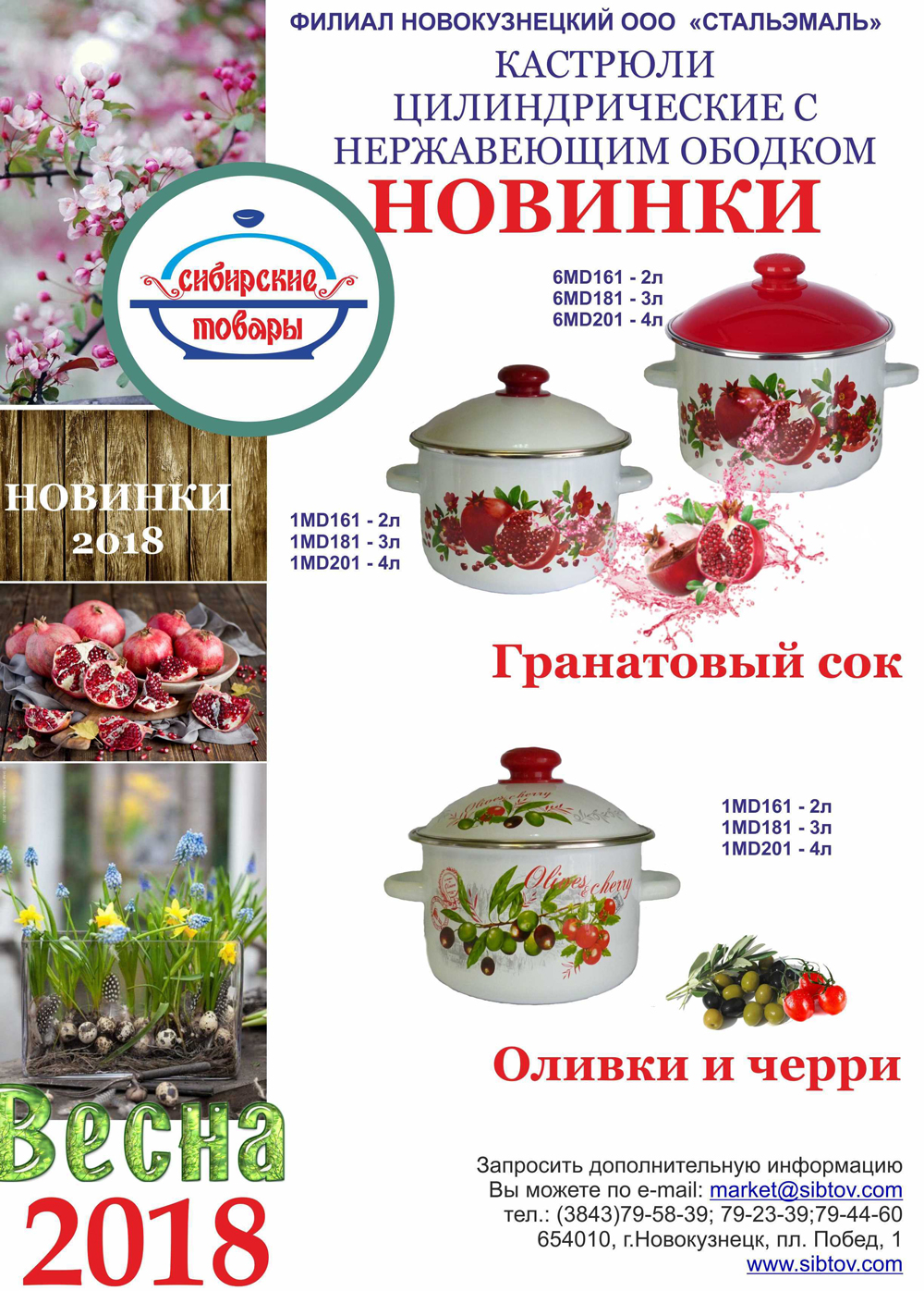 Новокузнецкий филиал компании "Стальэмаль" (торговая марка "Сибирские товары") представил новинки - цилиндрические кастрюли с новыми деколями "Гранатовый сок" и "Оливки и черри". В продаже представлены кастрюли объемом 2, 3 и 4 литра.