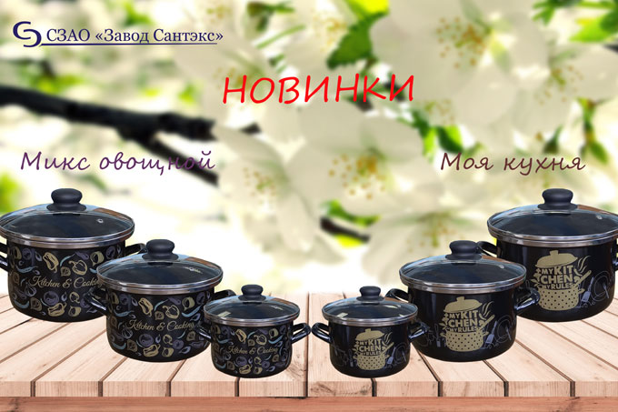 Завод "Сантэкс" выпустил новые линейки посуды из эмалированной стали черного цвета с деколью. В ассортименте представлены линейки кастрюль "Микс овощной" и "Моя кухня".