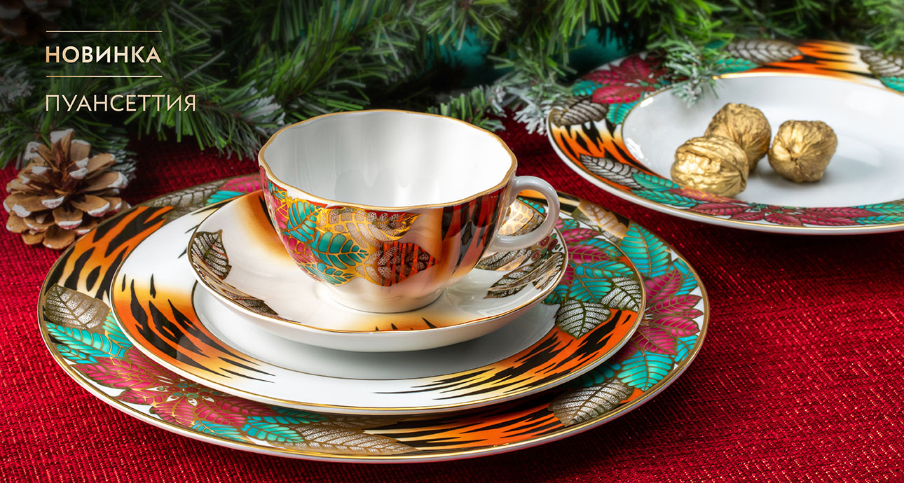Императорский фарфоровый завод представил новогоднюю коллекцию "Пуансеттия", созданную художником Любовью Цветковой.