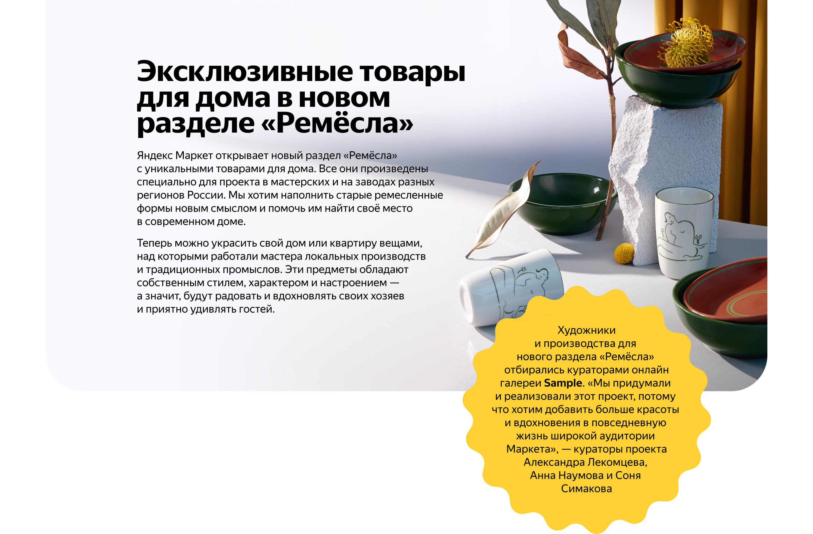 Маркетплейс «Яндекс Маркет» запустил новый раздел «Ремесла», в котором собраны товары для дома, созданные локальными мастерами и художниками на производствах из разных регионов России.