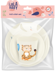 Компания Plastic Republic представила новый набор детской посуды для пикников Lalababy. В него вошли тарелка, миска и стакан с изображением тигренка.