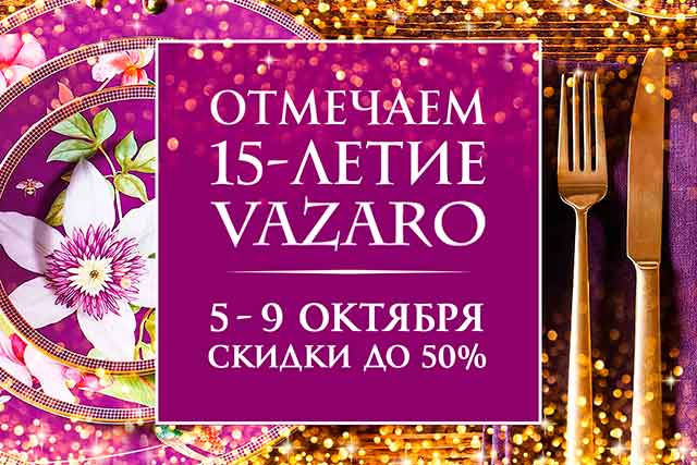 В интернет-магазине и розничных магазинах Vazaro проводится акция, приуроченная к 15-летию проекта. С 5 по 9 октября 2022 года на более чем 12000 товаров действуют скидки до 50%.