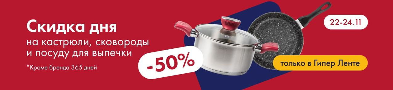 В магазинах «Гипер Ленте» с 22.11.2024 до 24.11.2024 проводится акция. На кастрюли, сковороды и посуду для выпечки будут действовать скидки до 50%.