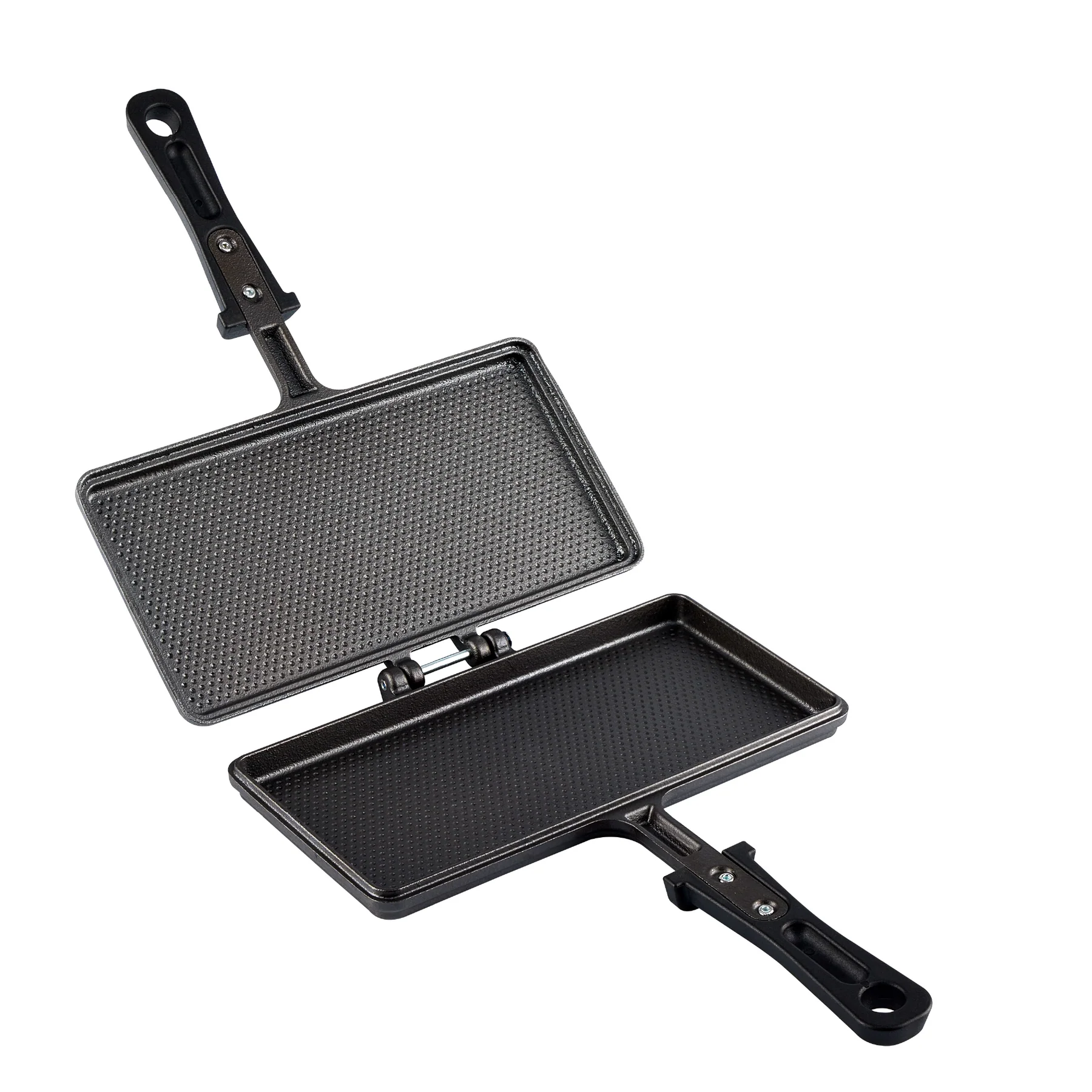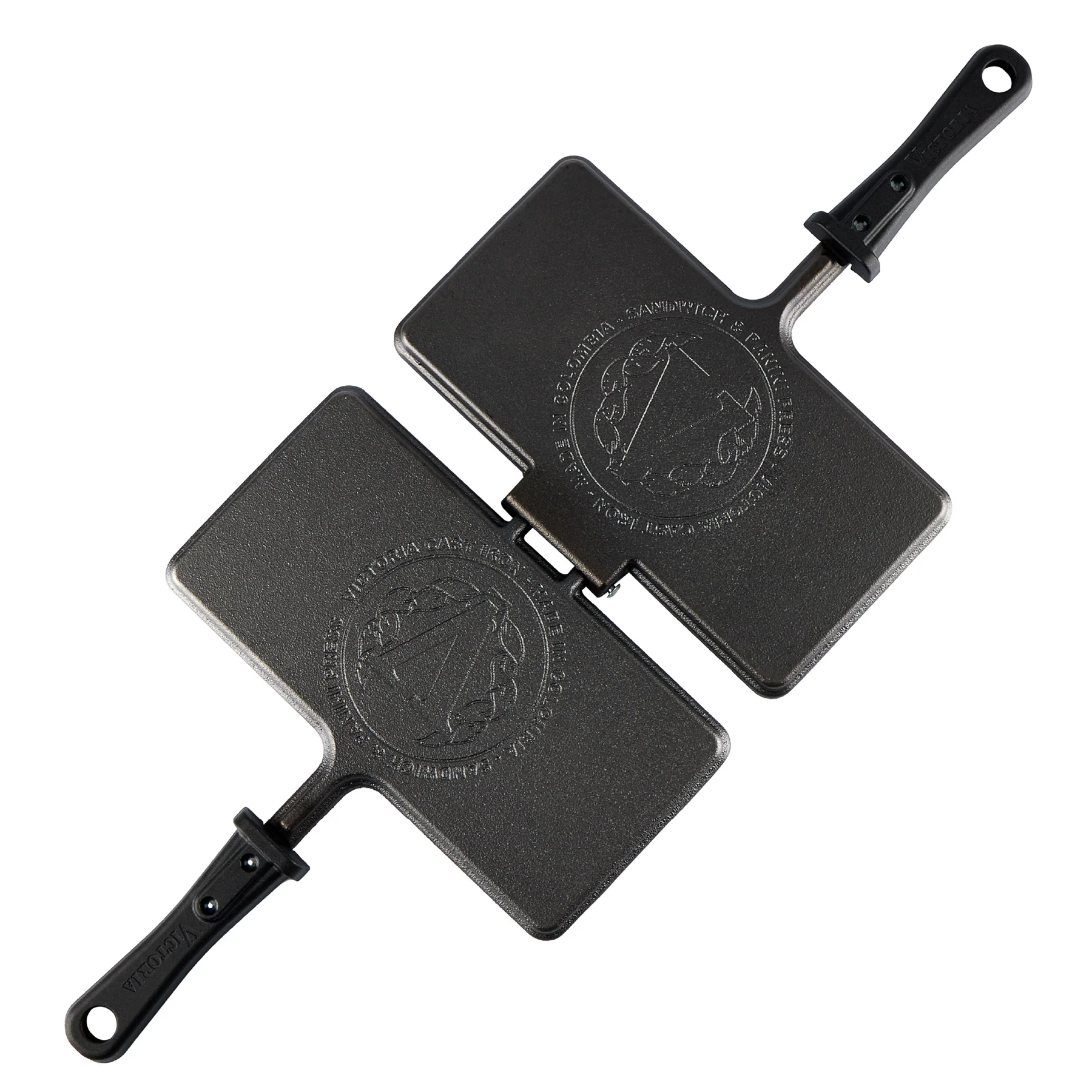 Колумбийский производитель чугунной посуды торговой марки Victoria выпустил двустороннюю сковороду для приготовления сэндвичей. Изделие имеет прямоугольную форму, внутренняя поверхность имеет рельеф. Ручка выполнена из бакелита и не нагревается.