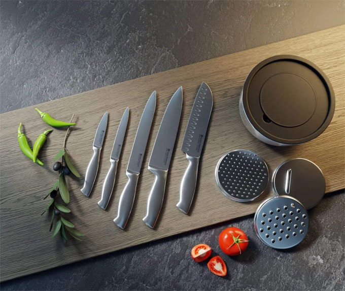 В сети магазинов "Пятерочка" на всей территории РФ в период с 27 мая по 25 августа 2025 года проводится акция лояльности на ножи торговой марки Swiss Diamond. В акции участвуют шеф-нож, разделочный нож, сантоку, универсальный нож и нож для овощей.
