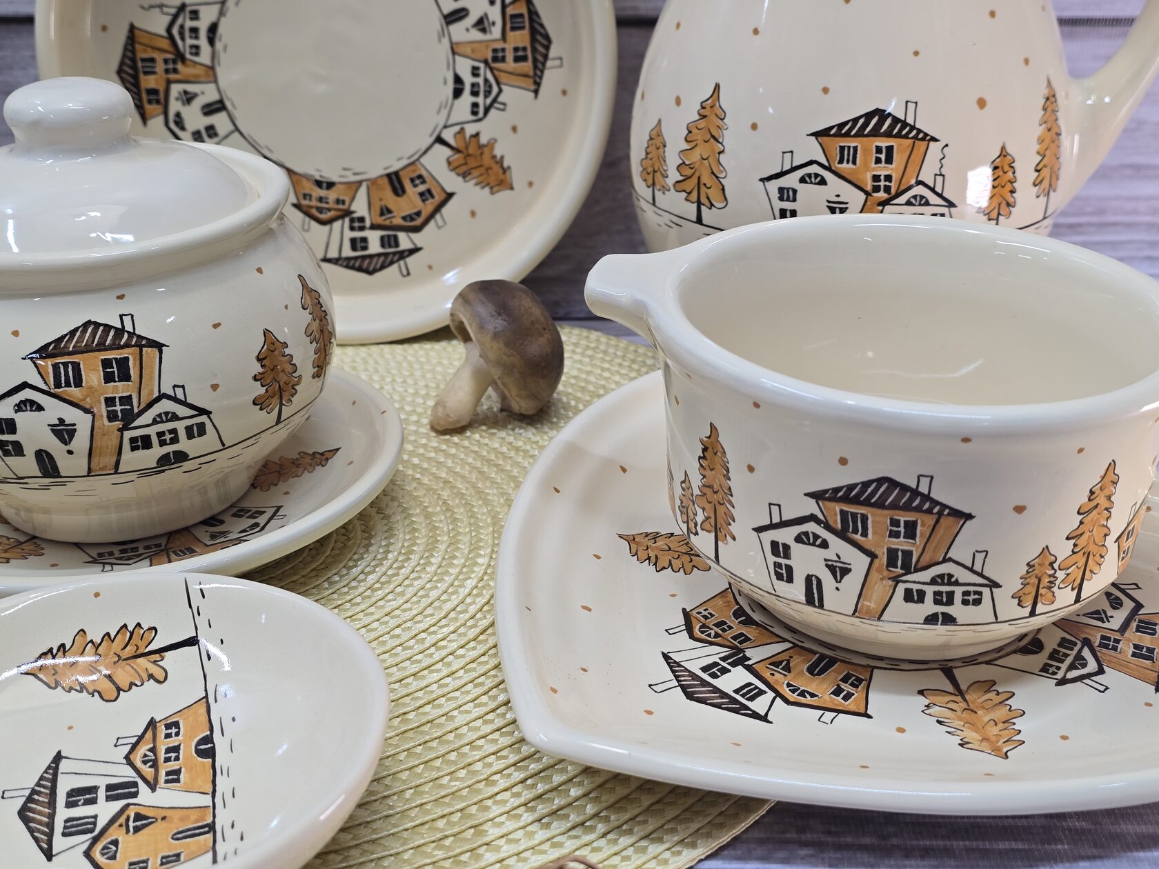 "Псковский гончар" выпустил новую коллекцию "Слобода". Посуда выполнена в теплых тонах и украшена рисунком с незатейливыми домиками и деревьями. Роспись на предметах выполнена вручную. В коллекции представлена посуда для сервировки и запекания.