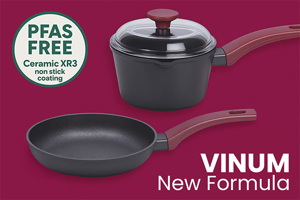 Итальянский производитель литой алюминиевой посуды с антипригарным покрытием Risoli представила коллекцию посуды VINUM New Formula, выполненную с покрытием Bioceramic XR3 без PFAS. В дизайне сочетается матовая отделка и ручка винного цвета.