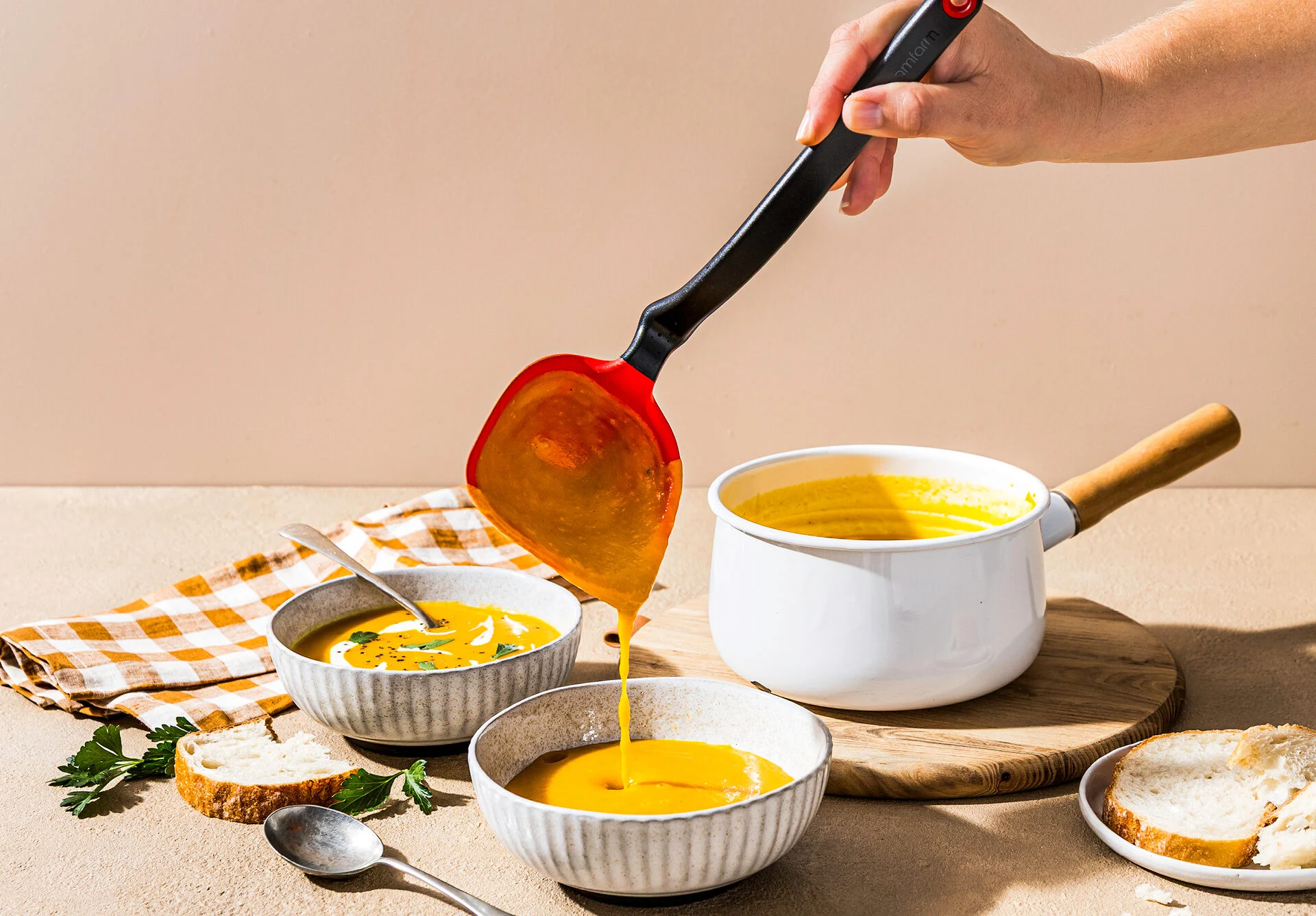 Гибкий силиконовый скребок собирает все до последней капли со сковороды или кастрюли, не повреждая покрытия и выдерживая температуру до 260 °C.