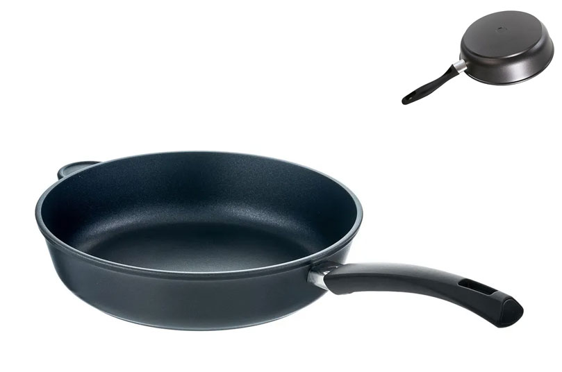 Сковорода из коллекции Gold торговой марки BERKRAFT (собственная марка сети Hoff) подходит и для индукционных варочных поверхностей. Толщина дна - 5 мм, антипригарное покрытие - Dursalete (GMM).