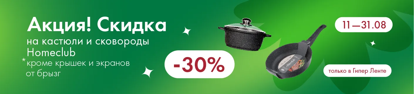 В «Гипер Ленте» до 31 августа 2025 года проводится акция. Покупателей ждет скидка в размере 30% на кастрюли и сковороды собственной торговой марки HOMECLUB (кроме крышек и экранов от брызг).