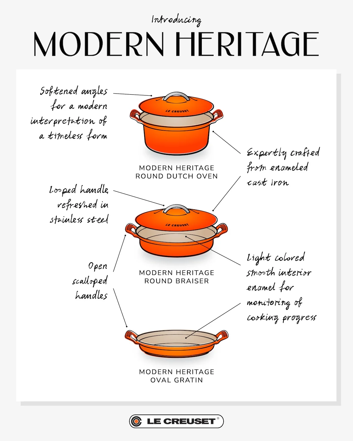 Посуда ручной работы Le Creuset традиционно выходит за рамки практичности и времени, обогащая жизнь яркими красками и причудливыми формами, продуманным дизайном и кулинарными возможностями. Коллекция Modern Heritageм переосмысливает элементы архивного дизайна, соединяя классику и современность.