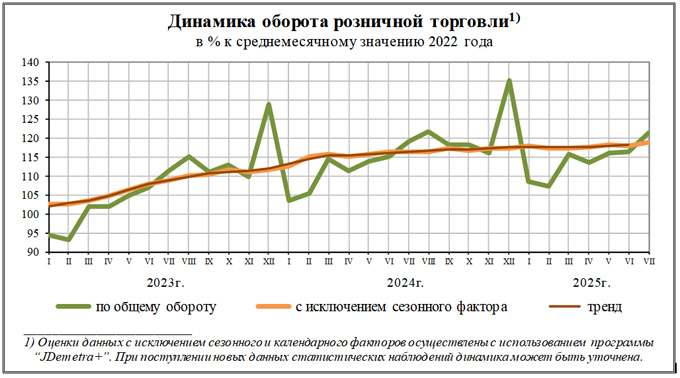 По данным Росстата, оборот розничной торговли в июле 2025 г. составил 5 197,6 млрд рублей, или 102,0% (в сопоставимых ценах) к соответствующему периоду предыдущего года, в январе-июле 2025 г. - 34 077,6 млрд рублей, или 102,1%.