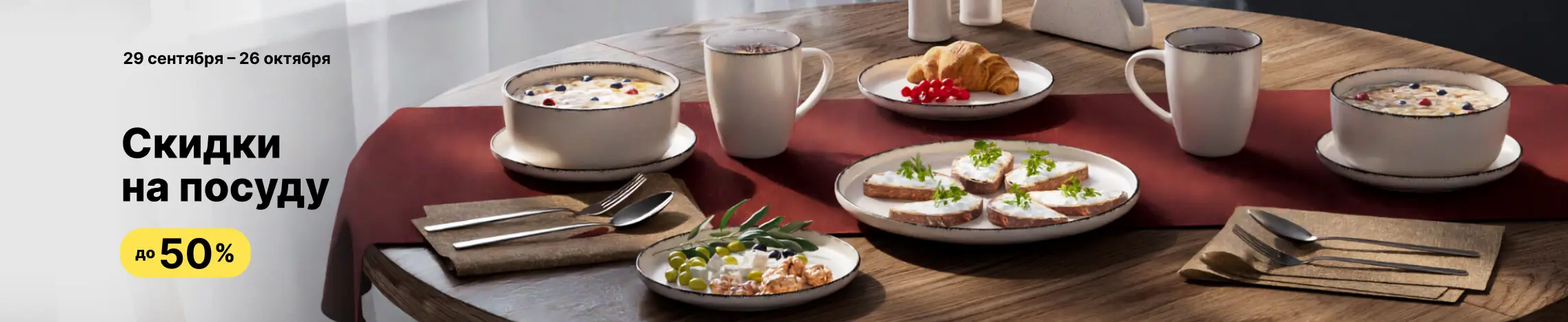 До 26 октября 2025 года в сети магазинов Hoff проводится акция. На выделенный ассортимент товаров из посудной категории действуют скидки до 50%. В акции участвует продукция торговых марок EVIO,