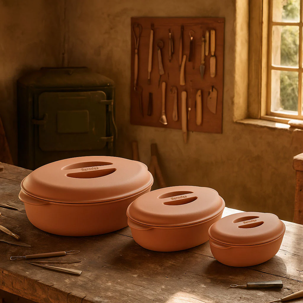 Немецкая торговая марка Berndes представила новинку: серию керамических жаровень для духовки b.terra. Изделия выполнены из глины и совмещают натуральность и экологичность с функциональностью. Крышки жаровень не имеют покрытия - перед готовкой их рекомендуется замачивать в воде, чтобы в процессе они отдавали влагу в продукты во время запекания или тушения.