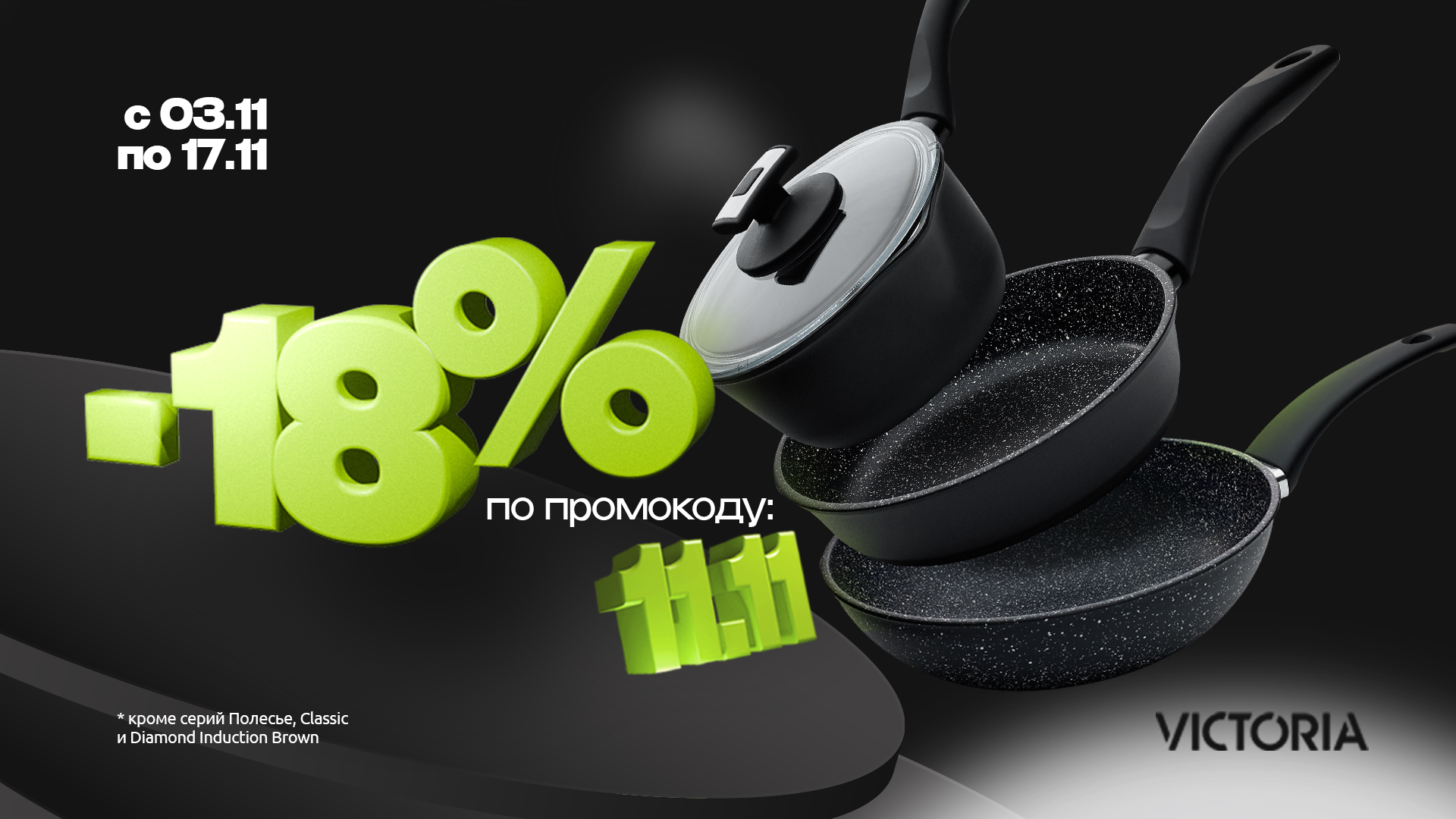 С 03.11 по 17.11 в интернете завода "Виктория" (Республика Беларусь) по промокоду "11.11" действует скидка 18% на посуду VICTORIA (кроме крышек, противней, серии Classic и Diamond Induction Brown).