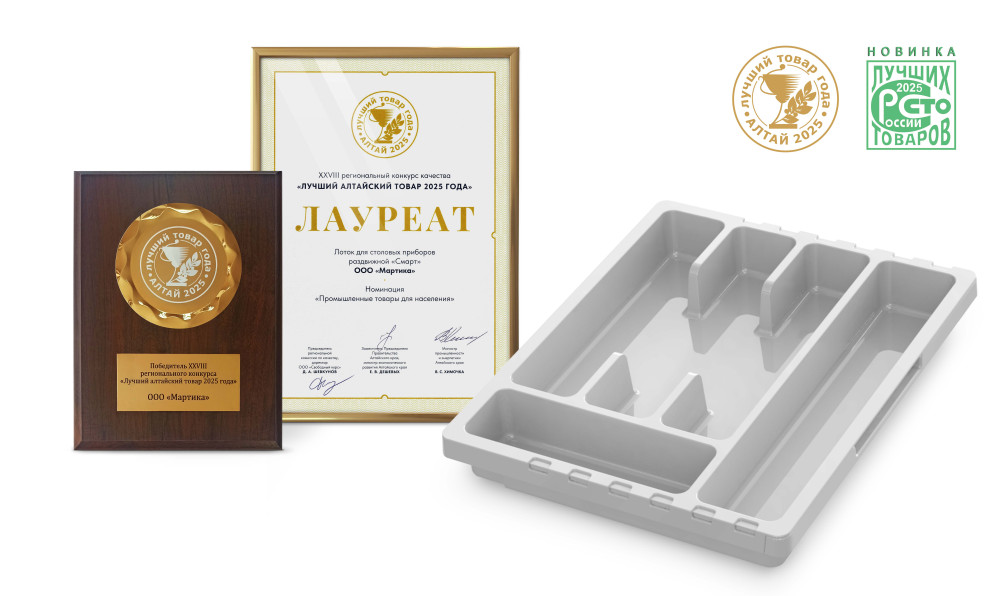 Компания "Мартика", производитель кухонной утвари из пластика, стала лауреатом федерального конкурса «100 лучших товаров России» в номинации «Новинка. Промышленные товары для населения», а также победителем регионального конкурса «Лучший товар Алтая 2025». Наградами отмечен раздвижной лоток для столовых приборов «Смарт».