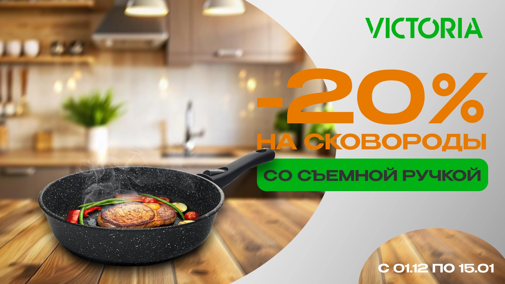 В интернет-магазине завода "Виктория" (Республика Беларусь) проводится акция. С 1 декабря 2025 года по 15 января 2026 года на сковороды со съемной ручкой действует скидка в размере 20%.