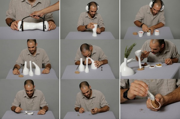 Современная посуда, как правило, выполняет лишь функциональную роль платформы, отделяющей поверхность стола от продуктов питания. Декоративность различных интерпретаций направлена только на то, чтобы радовать наш взор. Молодой израильский дизайнер-инноватор пошел гораздо дальше, предлагая три комплекта посуды, каждый из которых старается подключить к процессу еды ваше зрение, слух, обоняние, осязание и воображение.