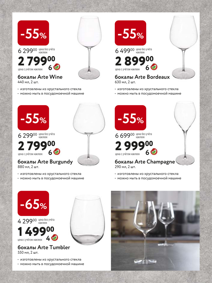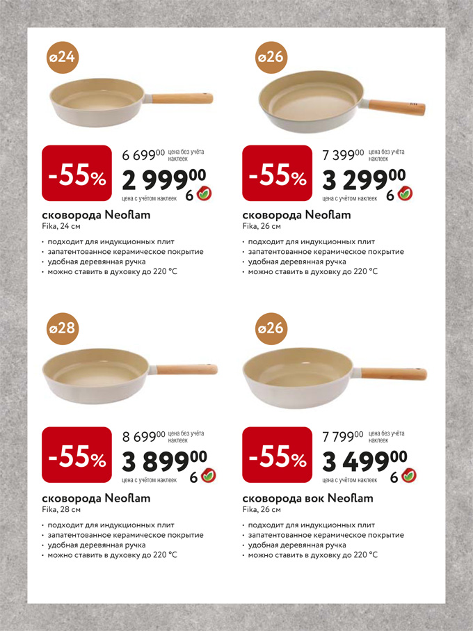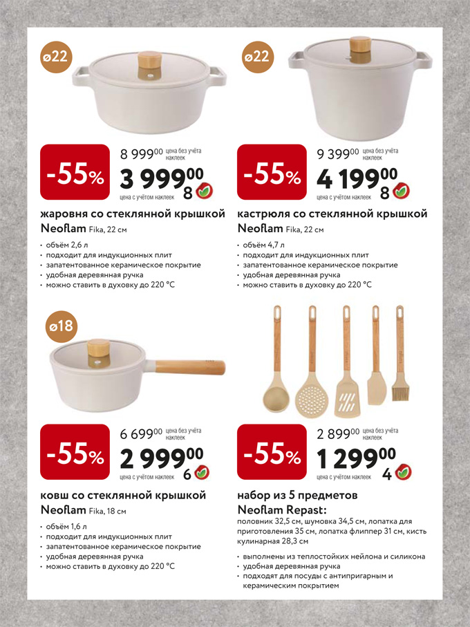 В федеральной сети "О'Кей" с 6 ноября 2025 года по 28 января 2026 года проводится акция лояльности. В ней представлены бокалы словацкого бренда RONA коллекции Art, а также наплитная посуда с керамическим покрытием коллекции Fika и кухонные ножи корейской торговой марки Neoflam. В течение срока действия акции покупатели магазинов "О'Кей" получают наклейки за каждые 300 рублей, определенное количество которых позволяет приобрести акционную продукцию со скидкой до 65%.