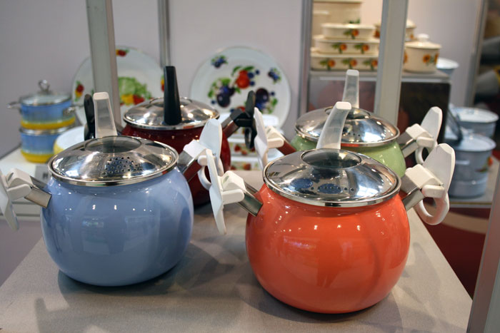 Лидер российского рынка, Лысьвенский металлургический завод, в этом году будет отмечать 100-летний юбилей производства эмалированной посуды. В последние годы этому предприятию есть чем гордится как в плане успешности своей экономической деятельности, так и в плане новых экспериментов. На прошедшей выставке посетители стенда ЛМЗ могли наблюдать сразу несколько новинок, из которых мы выбрали кастрюли новой формы с особой конструкцией ручек и крышек, удобной для слива воды. Их прототип впервые был представлен в январе на «Консумэкспо», a к весенней HouseHold Expo сотрудники завода подготовили расширенный ассортимент изделий, в том числе и с новыми, актуальными в этом сезоне цветовыми решениями. Хочется надеяться, что новые кастрюли поступят в серийное производство уже в ближайшее время.