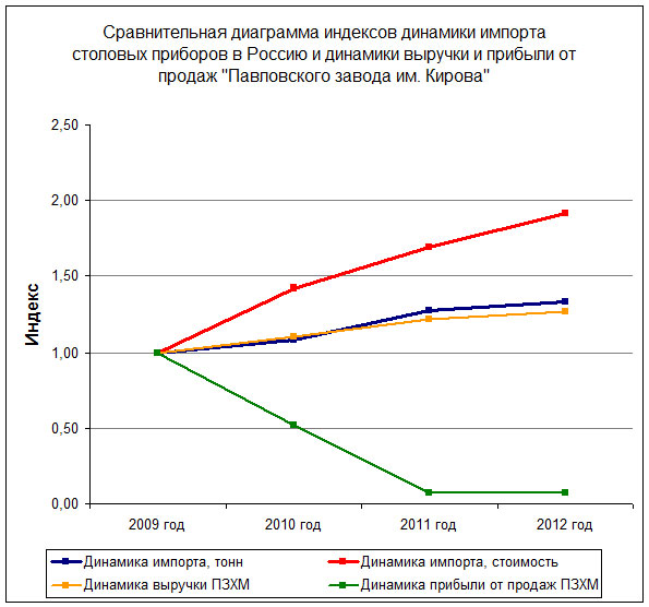 Импортные поставки столовых и кухонных приборов из нержавеющей стали из Китая в 1 полугодии 2013 г. осуществлялись по ценам на 35% ниже цен 1 полугодия 2012 г. Это оказало дальнейшее подавляющее влияние на цены производителей ТС и привело к падению рентабельности продаж до крайне низкого уровня и сокращению прибыли на 47,8%.