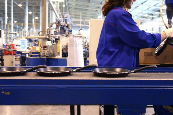 Затем к сковородам крепится ручка и дальше остается проверить их качество, упаковать и отправить покупателям.