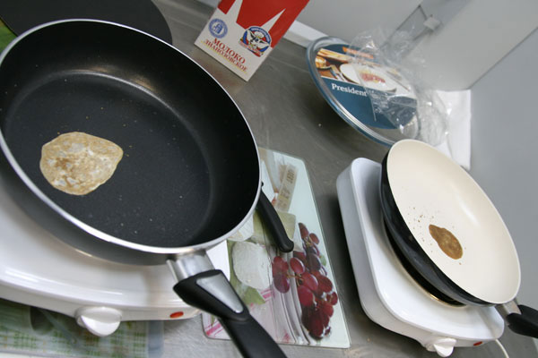 Последним местом экскурсии стала лаборатория по контролю качества. Журналистам показали, как производятся тесты на адгезию, на устойчивость покрытия к истиранию и на проверку антипригарных свойств. В последнем тесте в качестве контрольного экземпляра участвовала и керамическая сковорода итальянской марки Moneta. Оба образца испытания успешно прошли.