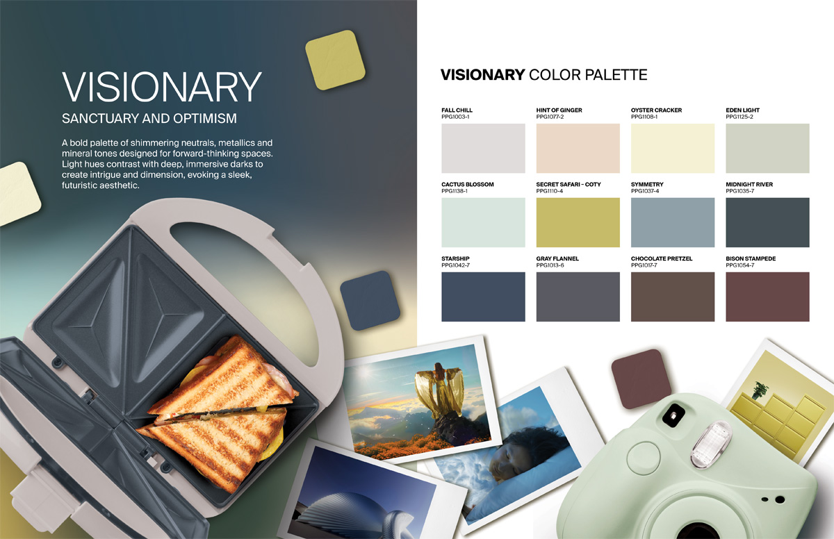 Visionary - палитра, сочетающая в себе смелый баланс светлых и глубоких оттенков, способствует созданию прогрессивных дизайнов с яркими контрастами и эффектными акцентами.