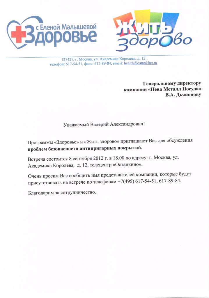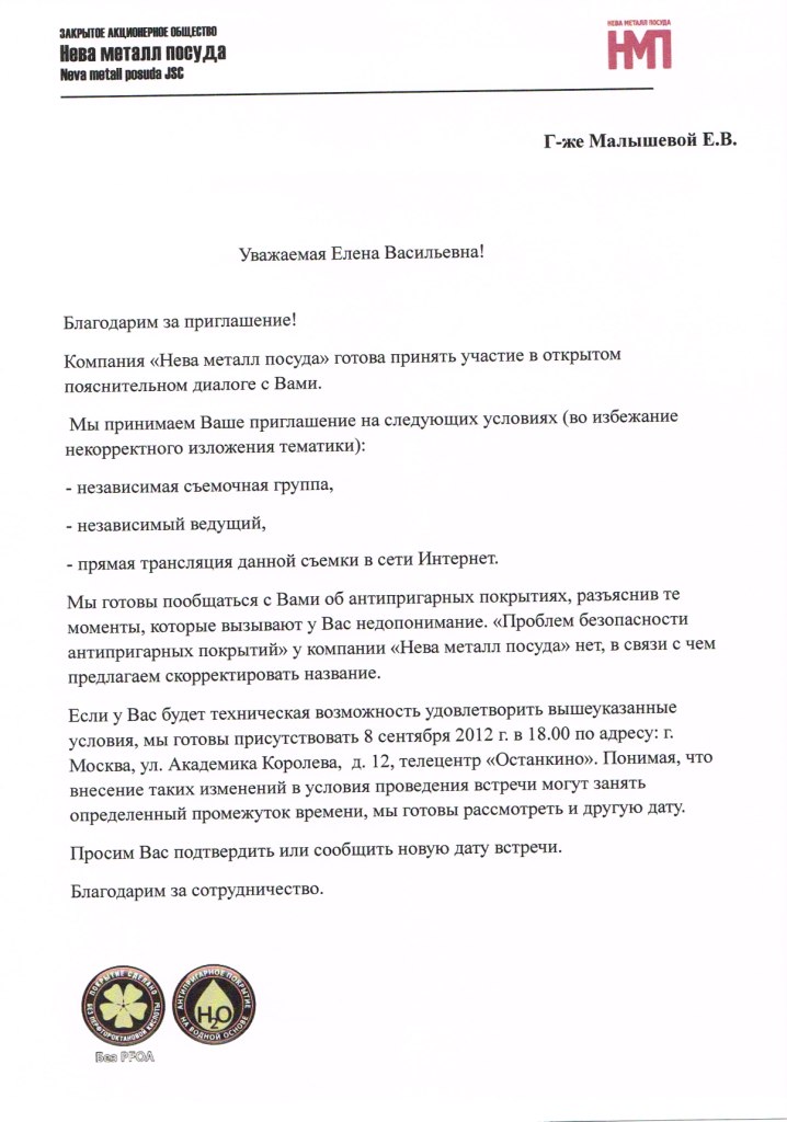 Программы Елены Малышевой "Здоровье" и "Жить Здорово" пригласили завод "Нева металл посуда" принять участие в обсуждении проблем безопасности антипригарных покрытий. Вместе с тем, завод выдвинул ряд условий: