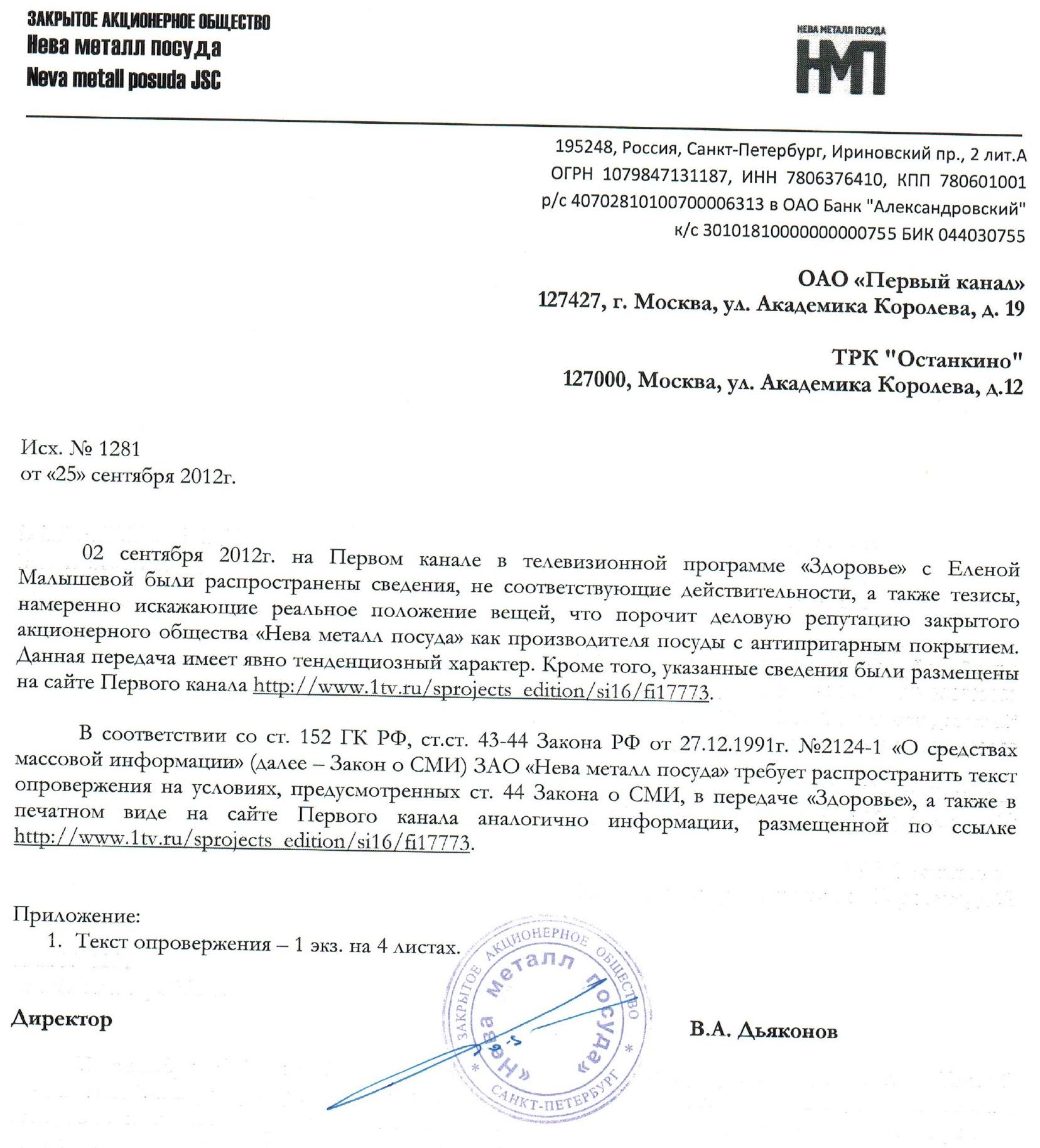 В опубликованном на сайте завода тексте письма говорится о том, что 2 сентября 2012 года на Первом канале в программе "Здоровье" с Еленой Малышевой были распространены сведения, не соответствующие действительности, а также тезисы, намеренно искажающие положение реальное положение вещей, что порочит деловую репутацию ЗАО "Нева металл посуда" как производителя посуды с антипригарным покрытием. В соответствие с законом "О средствах массовой информации" завод "Нева металл посуда" потребовал от Первого канала обнародования опровержения.