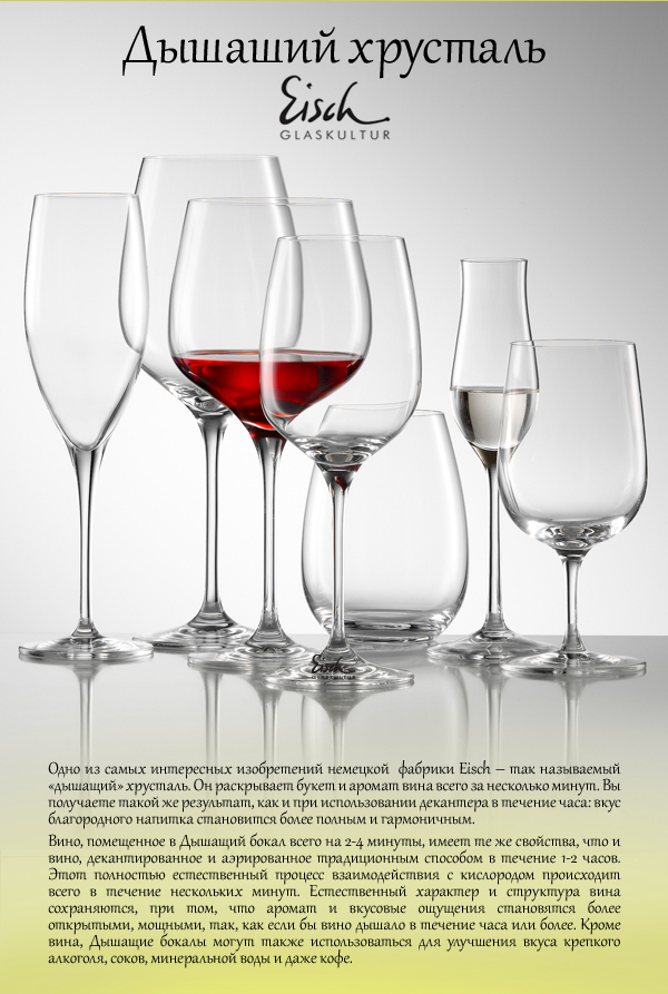 Сеть магазинов Williams & Oliver представила новую коллекцию посуды из хрусталя от баварской компании Eisch. Как утверждается на сайте Williams & Oliver, бокалы коллекции производятся из так называемого "дышащего хрусталя", который раскрывает букет и аромат вина всего за несколько минут (примерный эффект от использования декантера проявляется в течение часа). Бокалы и фужеры из «дышащего стекла» также улучшают вкус крепких напитков, соков, минеральной воды и кофе.