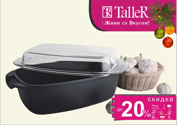 В акции участвует гусятница из литого алюминия с крышкой, сковороды со съемной ручкой, пароварка TR-1062, кастрюли 2.2 и 3 литра. Так же представлены набор кухонных принадлежностей, кухонные аксессуары – соусник, масленка, ковш, доска разделочная с кухонным молоточком. Оптовых покупателей в январе ждут скидки сразу на три вида наборов посуды TalleR – TR-1027, TR-1033, TR-7100.