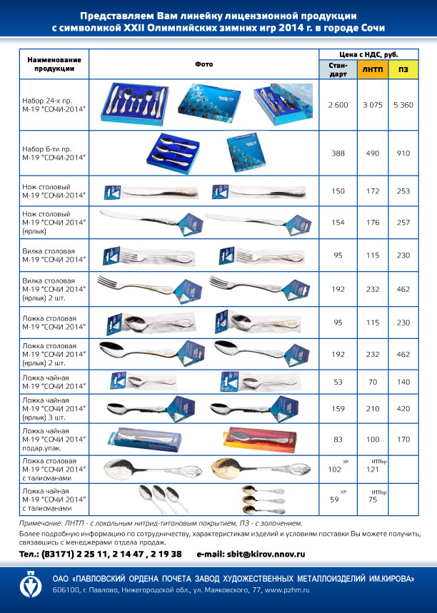 "Павловский завод художественных металлоизделий им. Кирова" представил ассортимент и цены на столовые приборы, выпуск которых осуществляется на основе лицензии Олимпийского комитета "Сочи-2014". В ассортименте представлены как наборы столовых приборов, так и отдельные предметы. Материал изготовления - серебро 925 пробы и нержавеющая сталь (в том числе и с различным декоративным покрытием - золотом в 24 карата или нитрид–титаном).