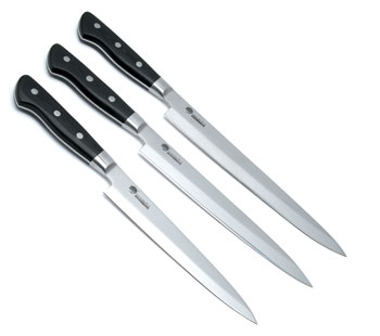 В серию Sugoisei вошли три ножа из нержавеющей легированной стали марки X50CrMoV15. Ножи рекомендуются для резки мяса и рыбы, но могут быть использованы и в качестве универсальных инструментов.