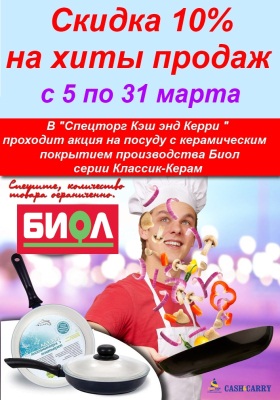 С 5 по 31 марта 2013 года в «Спецторг Кэш энд Керри» проходит акция на посуду с керамическим покрытием серии "Классик-Керам" производства украинского завода "Биол". Покупателям предоставляется скидка 10%.