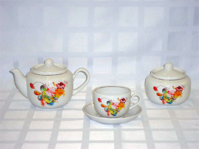 Сервиз состоит из 14 предметов - 6-ти чайных пар, заварочного чайника и сахарницы.