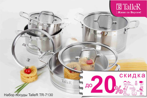 В июле торговая марка TalleR проводит распродажу для оптовых покупателей. В акции представлены наборы посуды TR-1027, TR-1028, TR-7130, чайник TR-1343, заварочный чайник TR-1348, набор столовых приборов TR-1631, набор ножей TR-2009.