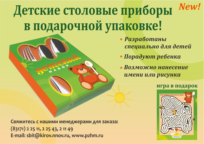 Павловский Ордена Почёта завод художественных металлоизделий им. Кирова представил новинку детский набор столовых приборов в подарочной упаковке, модель М-23. Изделия разработаны специально для детей, по желанию заказчика возможно нанесение гравировки, к каждому набору - игра в подарок.
