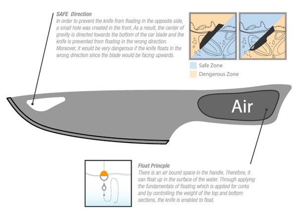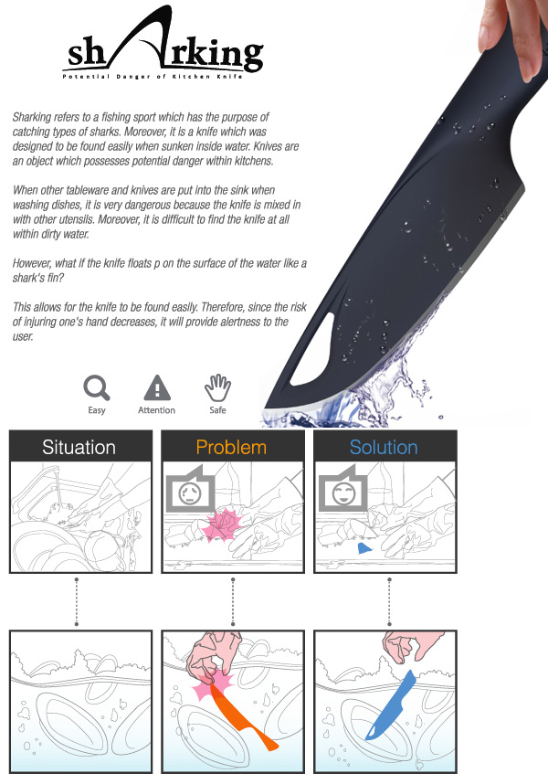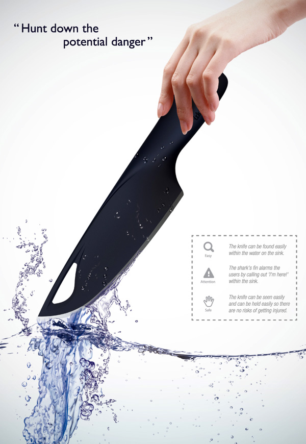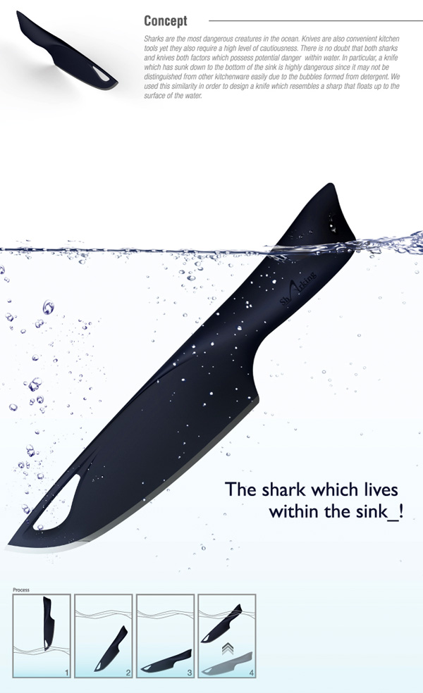 Дизайнеры обратили внимание на то, что часто при мытье посуды люди полностью наполняют раковину водой, и под мыльной пеной существует риск наткнуться на острый нож. Sharking исключает такую вероятность. Сконструированный по принципу поплавка, нож всегда будет плавать в полной раковине лезвием вниз, а его рукоятка будет торчать над водой, подобно акульему плавнику.