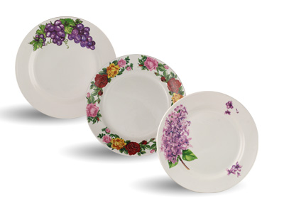 Такими рисунками цветочно-фруктовой тематики ранее декорировался фарфоровый ассортимент предприятия. Все три рисунка наносятся на полный ассортимент столовых форм, выпускаемых заводом.