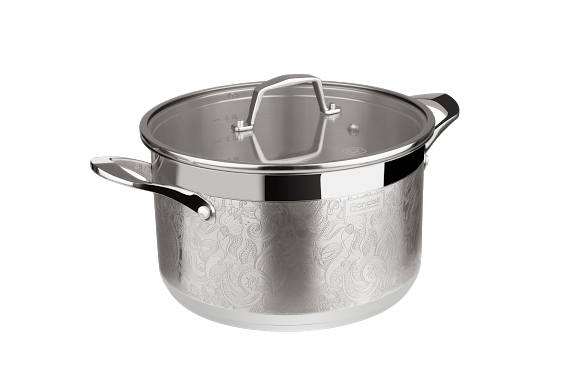 Röndell представляет коллекцию посуды из нержавеющей стали Fancy с оригинальным дизайном – растительный орнамент в стиле модерн, выполненный на корпусе посуды по технологии «deep etching» (объемное травление).